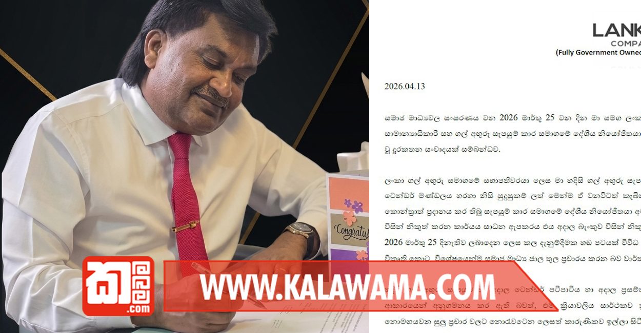 සමාජ මාධ්යවල සංසරණය වන තමා සහ ලංකා ගල්අඟුරු සමාගමේ සාමාන්යාධිකාරී සහ ගල්අඟුරු සැපයුම්කාර සමාගමේ නියෝජිතයෙකු අතර ඇතිවූ බව කියන දුරකතන සංවාදය පිළිබඳව ලංකා ගල්අඟුරු සමාගමේ සභාපතිවරයා නිවේදනයක් නිකුත් කර තිබේ.