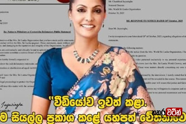 ‘Mrs. Sri Lanka’ (Mrs. World Sri Lanka Organization) සංවිධානයේ ජාතික අධ්‍යක්ෂ චන්දිමාල් ජයසිංහ විසින්, හිටපු (2019) ශ්‍රී ලංකා විවාහක රූ රැජිනක් වන කැරොලයින් ජූරි වෙත (18) ලිපියක් යොමුකර තිබුණා. ඒ, ඇය කළැයි කියන ‘අපහාසාත්මක ප්‍රකාශයක්’ ඉල්ලා අස්කර ගැනීමට හෝ නිවැරදි කරන ලෙස දන්වමින්. ඊට ප්‍රතිචාර දක්වමින්, කැරොලයින් ජූරි විසින් නිවේදනයක් නිකුත් කර තිබෙනවා. එම නිවේදනයට…